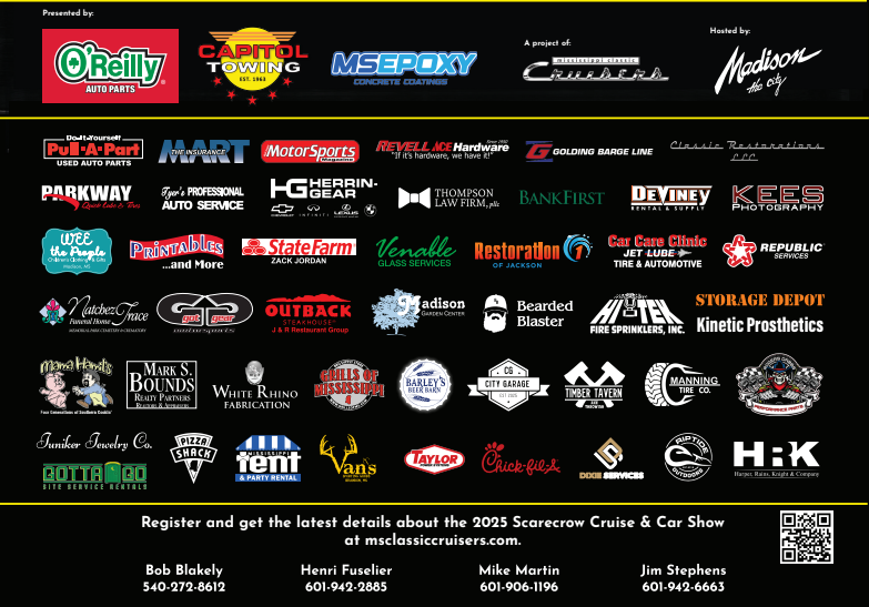 The Mississippi Classic Cruisers Car Club is very active in Mississippi and surrounding states for the past 20 years. A fun and active club of car enthusiasts with over 300 members. MCC hosts the largest car show in the Central Mississippi Area each October. Known as The Scarecrow Cruise and Car Show in Madison, MS, the net proceeds from Scarecrow are contributed annually to Mississippi based charities who typically do not get any major assistance from other national organization.